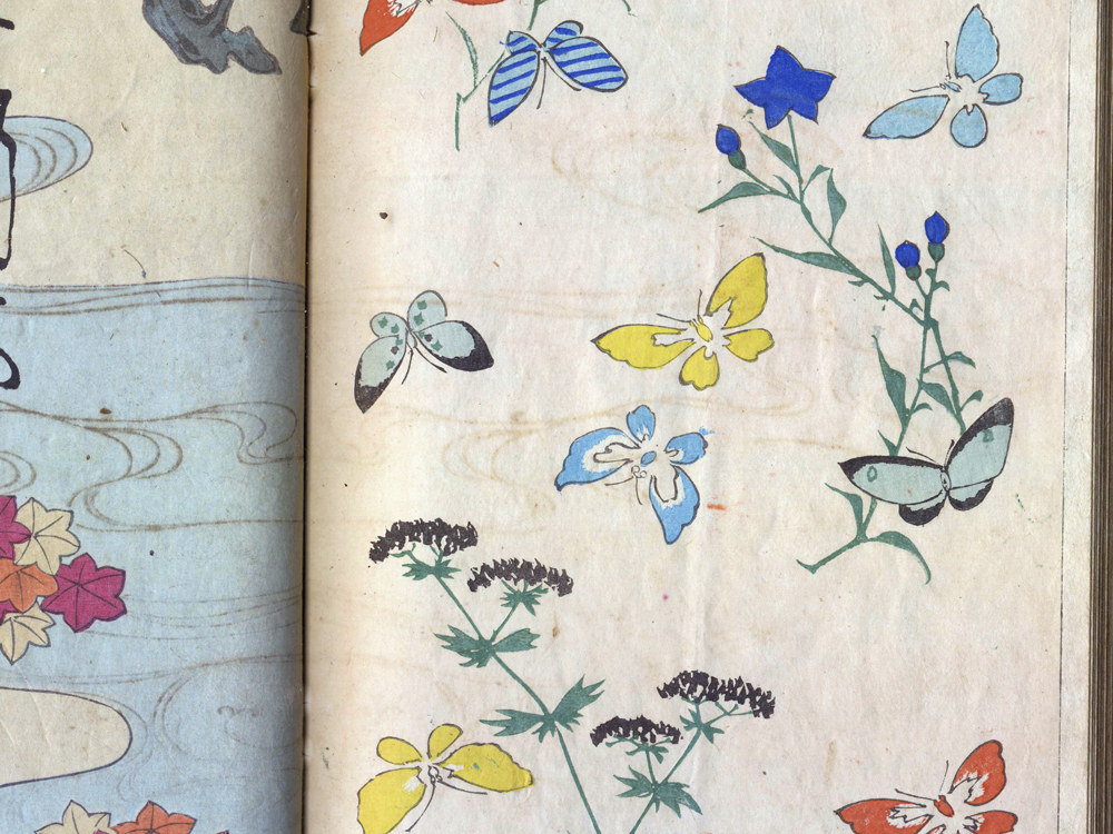この図案が収められているのは、明治29年に木版で印刷された図案帖です。一つひとつのモチーフは決して大きくありませんが、限られた枠の中に複数の草花と蝶を散らすことで、野に吹く風や、視線があちこちへ誘われるような広がりが感じられます。文様でありながら、どこか一場面を切り取ったような、物語性を帯びた構成が魅力です。