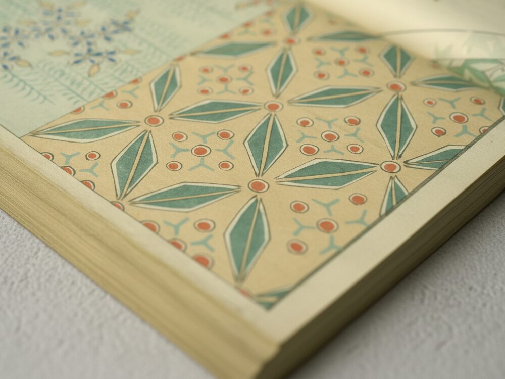 この文様は、明治36年(1903)に印刷発行された木版の図案帖をもとにしたものです。近代へと向かう時代のなかで、伝統的な吉祥意匠をいかに日常の暮らしへ取り入れるか──そんな工夫が感じられる一図といえるでしょう。