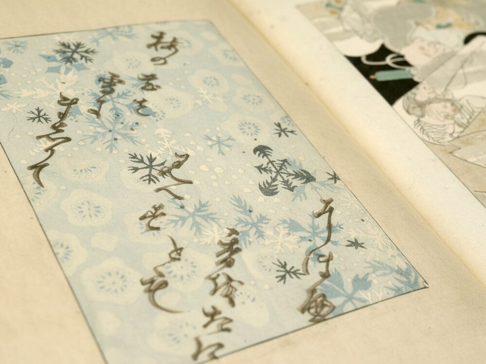 画面に広がるのは、雪の結晶を花に見立てて意匠化した「雪華」と、寒中に咲き、芳香を放つ梅。江戸時代後期、雪の結晶が観察されるようになると、その規則正しいかたちは人々の関心を集め、装飾文様としても親しまれるようになりました。六角形を基本とした雪華文様には、自然の秩序や、静かな美しさが映し出されています。