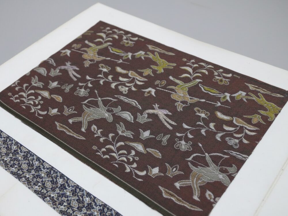 もっとも、この裂地から伝わってくるのは、そうした格式や儀礼性よりも、動きそのものの面白さです。人物の姿勢や動物の跳ねるような表現には、どこか力の抜けた素朴さがあり、見る側の緊張をふっとほどいてくれます。